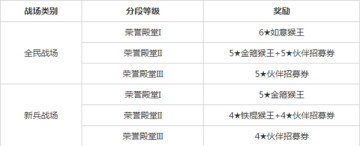 活动规则:在6月29日~7月5日这个周期内(完整的战场结算周期)战场最终结算时,新兵战场和全民战场获得荣誉殿堂I、荣誉殿堂II和荣誉殿堂III的玩家,可以额外获得精彩奖励喔。获得全民战场荣誉殿堂I的玩家,更是可以获得6★如意猴王一个。奖励列表如下