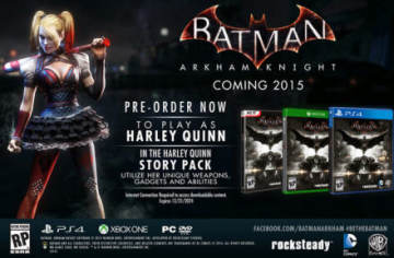 《蝙蝠侠 阿克汉姆骑士》预定特典为小丑女DLC 来源: 飞翔小编feichenpan 2014/6/30 21:46:24 浏览量:485 《蝙蝠侠阿克汉姆骑士Batman:Arkham Knight》预定特典现已正式曝光,提前预定本作的玩家都将获得小丑女哈利奎恩的DLC追加剧情,其名为“Harley Quinn故事包”,玩家可以操作小丑女体验游戏故事剧情,还能使用她特别的武器道具和技能来完成各种挑战,此外DLC还有4个新增地图可供游玩。