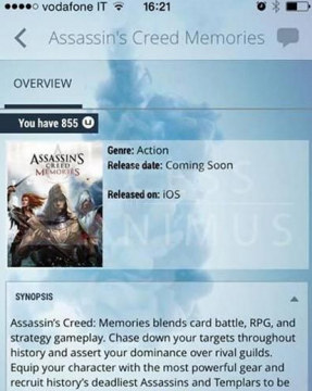 近日,国外媒体曝光了一张关于育碧刺客信条新作的截图,该截图显示出名为《刺客信条:回忆》的游戏即将上架ios的消息,这是否预示着刺客信条手游即将来临?