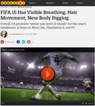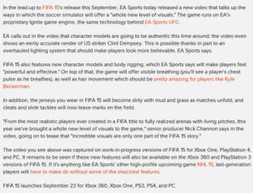 根据国外游戏媒体Gamespot最新情报,《FIFA 15》将给玩家提供一种更高层次的视觉享受,为球员加入呼吸和头发飘动效果,游戏中球衣也会因为泥土和草地而变得更脏,而滑铲等也会在草地上留下痕迹,提供更加真实的光影系统。《FIFA 15》将于2014年9月23日发售,登陆PC、PS3、XBOX360,PS4和XBOX ONE平台。