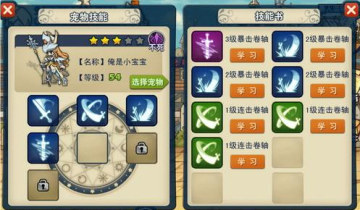 得到宠物技能书后,可以让宠物进行学习。宠物技能书会为宠物增加属性以及战斗中的攻击效果,用处非常大。每种技能书都分为三个等级,学习的技能书会随机进入到宠物的技能格中。