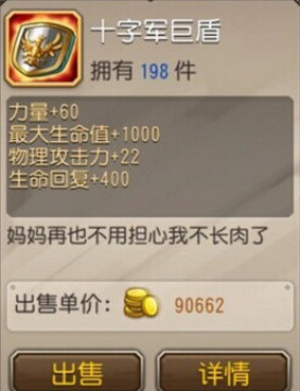没有最强只有更强,小冰冰还没有从上一件装备带来的冲击波中缓过神,就又发现了一件神器。不仅生命值要高过红宝石吊坠,更拥有不错的物理属性加成及相当可观的生命回复。看来坦克哥哥们有福气啦,满附魔“十字军巨盾”,你值得拥有!