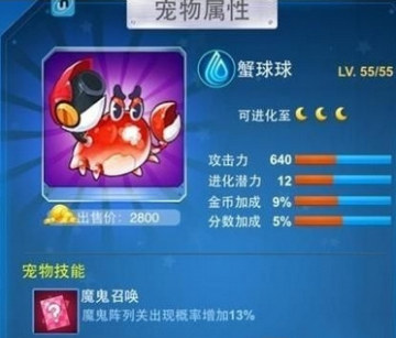 根据上方的满级属性来看,全民飞机大战蟹球球是一只属性为水的宠物,可以进化,我们可以通关金币抽取、积分抽取及兑换,可进化的水系主角宠河蟹中的胖球球,最擅长横着走,满级属性也非常的强悍,是一只非常值得培养的宠物之一。