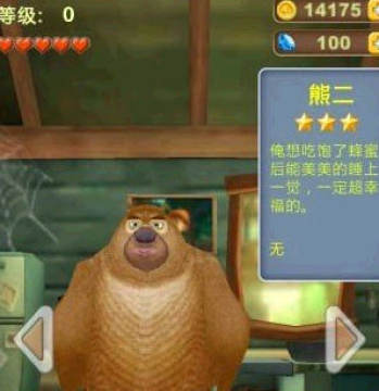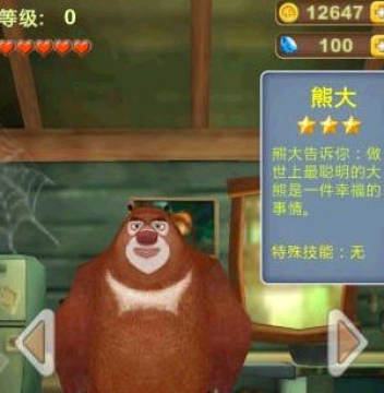 特色:游戏中的熊大和动画片中的一样,它最爱说的一句话就是做世上最聪明的大熊是一件幸福的事情。虽然一开始没有什么技能,但会随着升级来提升技能。