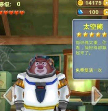 特色:游戏中的太空熊穿着一身航空服,看起来非常高端洋气,太空熊的特殊技能就是拥有它就等于多出来了一次生命,很是爽快。