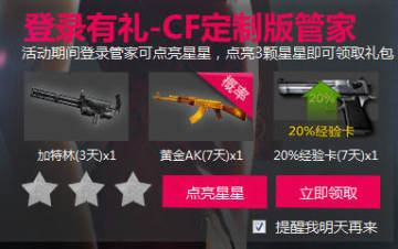 腾讯近日推出了电脑管家cf定制版,活动期间玩家登录cf管家可点亮星星,点亮3颗星星即可领取礼包,其中就有黄金AK,加特林,经验卡等,下面一起来看看cf定制版电脑管家活动介绍吧。
