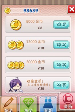 《爱养成2》金币怎么得 赚钱方法介绍 来源: 飞翔小编 2014/7/8 10:28:37 浏览量:535 在手游《爱养成2》中,金币是唯一货币,玩家作为养父养母可以学点赚钱技巧好帮助女儿成长,《爱养成2》金币怎么得,如何赚钱呢?这里给大家分享下《爱养成2》金币的获得方法。1.日程安排打工这是最传统的赚钱方式啦,打工会有疲劳值,因此在日程安排中也要注意休息哦~2.完成任务很多小伙伴会忽视游戏屏幕右上方的任务图标,在玩游戏时可以有目标地去完成任务,游戏赚钱两不误~3.商店购买土豪玩家可以通过商店购买金币,更快体验游戏内容。