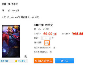 lol英雄联盟新皮肤金牌主播德莱文现已在商城上架,其购买时间限定为2014年7月8日至12月31日,金牌主播德莱文售价为69.00Q币,财付通价为65.55元。
