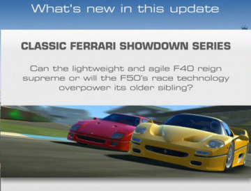 此次更新版游戏添加了两款全新的经典法拉利跑车:由 Enzo Ferrari 专为法拉利40周年庆而设计的收山之作——Ferrari F40,以及1995在全球仅推出349辆的 Ferrari F50。有了两款如此经典的赛车,游戏中也添加了一个专门为经典赛车而设的“法拉利决赛”以及“抓地达人系列赛”,让玩家们能驾驶F40与F50等经典赛车进行比拼对决。