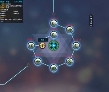 此心法总共有:三个力道穴、一个洞察穴、一个身法穴、一个气劲穴、两个根骨穴。其中穴位《力明》为被动技能,百分比增加力量的被动。共分10层,每层1%。