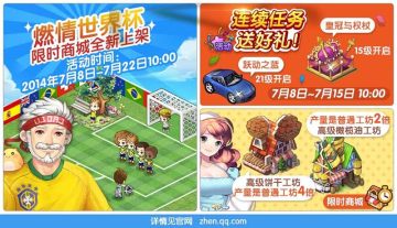 腾讯游戏《全民小镇》将在2014年7月举行大量暑期活动,其中包括世界杯决赛周玩转世界杯主题建筑,连续任务领奖励,周末登录送建筑,还有限时爱心、限时商城物品等多重好礼来袭,这里给大家分享下《全民小镇》2014年7月暑期活动介绍,各位玩家不要错过了。