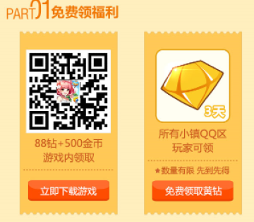 1.30钻+8888金币,每个账号限领一次,在小镇公众号qmtown福利专区领取.
