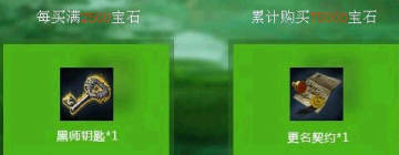 2、活动期间,账号每购买满2500宝石,将获赠“黑狮钥匙*1”,当购买宝石数量达到75000时,更可额外获得“更名契约*1”。