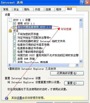 4、将“通过代理连接使用 HTTP 1.1”前面的勾勾去掉,然后重新登录游戏即可