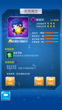 很多小伙伴在打飞机时都想碰到疯狂道具关卡,因为疯狂道具不仅仅可以提供高额的分数加成还可以为你补充大量的生命值。当然很多小伙伴们也会抱怨遇到疯狂道具关卡出现的几率太低吧,那就赶紧来看一下我们新宠物啵啵妖的神秘技能吧。不错,就是道具召唤,此技能在啵啵妖达到满级之后可以使疯狂道具关卡出现的几率增加12%,如果搭配两只啵啵妖的话那可就是24%呀,你还怕你碰不到疯狂道具吗?到时候想不碰到都难!