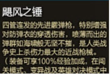 四管连发的先进散弹枪,特备增强对防弹衣的穿透伤害,喷薄而出的弹群如海啸般无坚不摧,是人类战争史上杀伤力最大的近战枪械。(享受100%的经验加成,在各种模式中也会获得伤害加成。)
