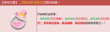 《QQ飞车》玩家在2014年7月14日至9月22日期间可以在官方商城购买“美味甘霖”道具,开启美味甘霖可以获得永久S车、永久A车、首发极品套装、极品戒指、极品背饰等丰富奖励,下面一起来看看吧。