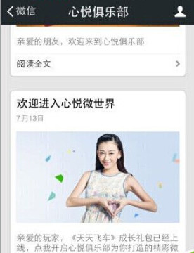 《天天飞车》心悦俱乐部礼包领取方法介绍 来源: 飞翔小编 2014/7/14 16:25:19 浏览量:795 《天天飞车》近日更新了最新版本,玩家可以参与微信心悦俱乐部,领取心悦俱乐部礼包,这里给大家分享下《天天飞车》心悦俱乐部礼包的领取方法。心悦俱乐部礼包领取方法: 1、登陆微信,在添加好友栏搜索心悦俱乐部并关注。 2、打开心悦俱乐部,然后绑定天天飞车游戏的登陆帐号,再 进入心悦微世界。 3、点击打开“我的心悦”,就可以看到成长礼包、活跃礼包、特权礼包等相关礼包了。其中成长礼包需要充值6元才能领取,其他的都是免费领取。