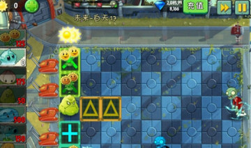 同样的还是先将双胞向日葵种种到最左边,等到第一个僵尸出现之后直接使用寒冰射手清理清理掉。而第二个僵尸出现后使用窝瓜消灭。这里会获得第一个能量豆,直接用在向日葵上面。
