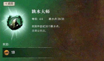 成就分四个阶段,1次、10次、22次、38次各奖励一次,一共是18点成就点数。下面我们就一个区域一个区域的把跳水点标出来,跳水大师从这里开始!