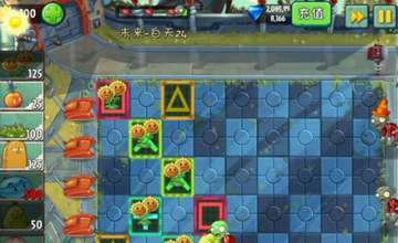这一关将所有的双胞向日葵种都种到能量场上,因为本关阳光的获得一定要十分的快,能量豆也是要全部都使用到向日葵上。前期的两个僵尸全部使用窝瓜来解决。