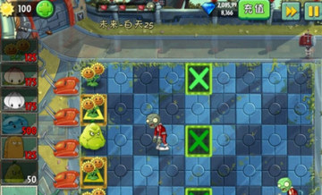 开始的时候现在左边种上一排双胞向日葵,前面2只僵尸大家可以使用窝瓜来解决。