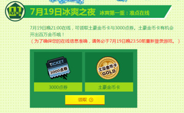 7月19日晚21:00,准时在线即可领取3000点券与土豪金币卡。