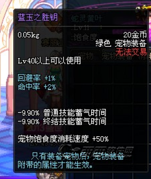 重量0.005kg,绿色宠物装备,LV40以上才能用,回避+1%,命中+2%