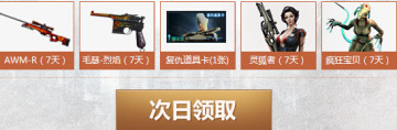 AWM-R(7天)、毛瑟-烈焰(7天)、复仇道具卡(1张)、灵狐者(7天)、疯狂宝贝(7天)