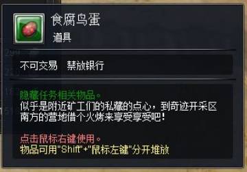 《幻想神域》食腐鸟蛋怎么得 食腐鸟蛋作用介绍 来源: 飞翔小编 2014/7/21 16:38:58 浏览量:677 食腐鸟蛋是《幻想神域》游戏里的一个道具,可以用来完成任务,获得奖励,那么具体是干什么的呢,来看看吧。烤鸟蛋食腐鸟虽然是一种危险的生物,不过它的蛋相当的美味,有机会可要品尝一下。(在奇迹开采区找到食腐鸟的蛋,前往奇迹开采区的营地将蛋烤熟。)招待券 +7成就点数 +1事件起点:食腐鸟蛋获得称号:鹅妈妈伤害值 +24我还没到当父母的年纪。 ※获得成就:「烤鸟蛋」时取得。 称号附加能力将在等级40开启。如果玩家在 45 级前完成可获得以下奖励原地复活羽毛(限定)