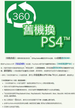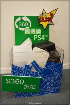 在香港动漫电玩节2014期间,索尼PlayStation将在现场举行“360旧机换PS4优惠”活动,玩家只要自己携带旧款主机到PlayStation展区购买PS4主机,就可以当场活动360港币的折扣,用于购买PS4主机或同捆套装。此外参与360旧机换PS4优惠计划的玩家更可以半价购买PSV TV主机,各位索尼主机玩家不要错过了。