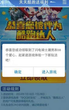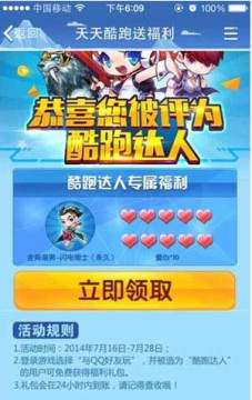 玩家打开手机QQ,然后找到“天天爱游戏”,没关注的玩家请先关注它,然后进入后就可以看到“恭喜你已获得酷跑达人”,点击立即领取后,打开游戏,在邮箱里找到系统邮件,就可以得到永久角色闪电骑士。