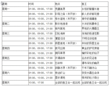 《幻想神域》全地图鱼王刷新时间表一览 来源: 飞翔小编 2014/7/22 14:23:37 浏览量:19490 钓鱼玩法是幻想神域游戏的独特玩法,鱼王又是玩家需要挑战的目标,那么鱼王的刷新时间是什么时候呢,这里把所有的鱼王刷新时间进行了汇总。