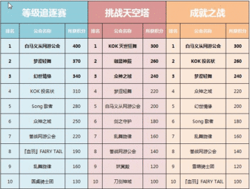此次“进击の红名公会战”中,我们一共设置了等级追逐赛、挑战天空塔、成就之战三项比赛,通过三项比赛的积分总和,来计算出我们获胜的前十名公会。