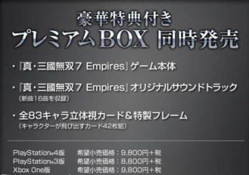 《真三国无双7帝国》豪华限定版BOX情报曝光 来源: 飞翔小编feichenpan 2014/7/23 22:17:57 浏览量:477 Koei官网最近曝光了《真三国无双7帝国》豪华限定版BOX情报,该作预计2014年9月25日发售,登陆PS4,PS3和XBOX ONE三大平台,其中PS4和XBOX ONE豪华限定版BOX售价为9800日元,而PS3版BOX售价为8800日元。豪华限定版除游戏本体外,还附赠收录16首新曲的CD,全部83名角色的立体视觉卡片,42名有出屏效果。