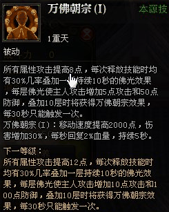 万佛朝宗(I):移动速度提高2000点,伤害增加30%,每秒回复2%血量,持续5秒。