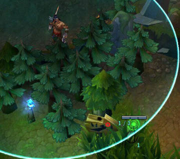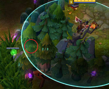 边路的草丛眼:在这里,尤其是当你是紫色方打下路时,你可以直接把眼插在边路的草丛里。当你是蓝色方时,上路的草丛也可以这样插。这样插眼的好处是,安全,还可以洞察这个草丛附近有没有敌方打野的动向。