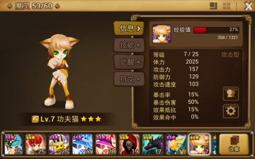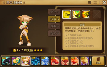 功夫猫是攻击型三星魔灵,除了萌萌哒的外表外,输出也很给力,技能保证输出的同时对敌人也有一定的控制作用,猛虎出林配合一些特殊魔灵能发挥奇效,加之攻击速度快,是一个很不错的魔灵!