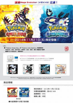香港任天堂公司最新宣布支持亚洲中文版3DS掌机的《口袋妖怪 红蓝宝石重制版》将于11月21日与日本同步发售,其售价349港元,配备有中文电子说明书,游戏可从日文,英文,意大利文,西班牙文,法文,德文,韩文七种语言中选择,中文不包含在内,敬请各位国内玩家谅解,看来任天堂还是没有把华人玩家记在心上,继续教大家七国语言。