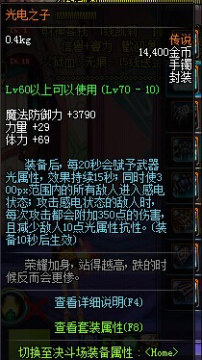 评价:本身属性还不错,戴上去约等于附魔了光属性,使压缩、打桩机、格林等技能附上光属性。不过会有5秒钟的属性空挡,使用时要注意。它的亮点在于可以使一定范围内的敌人附加感电状态,还可以减光属性抗性十分不错。不过由于其蛋疼的装备10秒后生效,因此如何合理的使用它成为各位不可或缺的必修课。