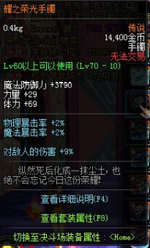 评价:没有金手镯的亲们强烈推荐去做这东西,几乎可以说是必备装备。有了金手镯的同学如果为了那多的一点点力量和2%暴击也可以去做它。对于各位而言遗迹并不难打吧?打王级的都能一下子做好。用50天的切换频道掉线换来这么一个给力的装备非常值得。