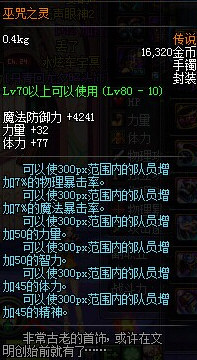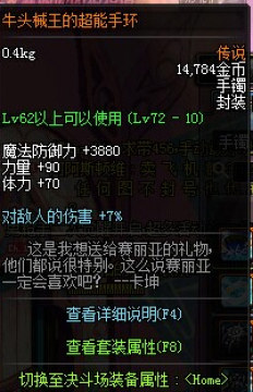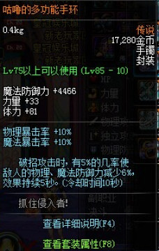 评价:其实我都在怀疑要不要盘点这货,但看在有点用处的地方上就摆出来了。神壕估计都不会用的手镯,花钱大提升小。好像是任务手镯吧(在NPC鲁特的店中购买),一般就无视掉吧。