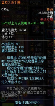 评价:相对于遗迹手镯而言也就多了几十点力量,却少了2%的暴击和2%的伤害,这里就被遗迹超越了。被遗迹手镯爆掉的关键在于:你丫的这货是人品货!掉落地点为JJ牛BOSS。我相信没人会蛋疼到花钱去买这种人品货而不去做遗迹的吧。土豪无视我就好。