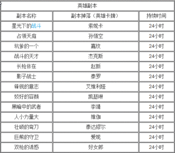 玩家可以通过刷英雄副本,英雄副本会掉落橙色英雄卡牌,英雄副本信息如下:
