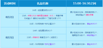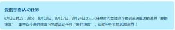 8月2日的15:30分,8月10日、8月17日、8月24日这三天任意时间登陆也可收到系统赠送的道具“爱的惊喜”,集齐四个爱的惊喜可完成活动任务“爱的惊喜”,领取任务奖励3000点券!