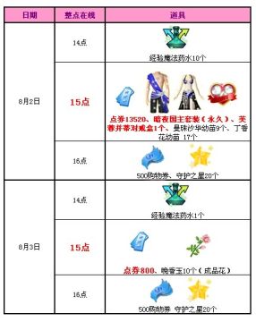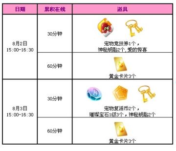 8月2日至8月3日,每天15点至16点30分期间,累积在线30、60分钟,可获得宠物道具、神秘钥匙、黄金卡牌。其中8月2日活动时间累积在线30分钟还可以获得特别任务道具“爱的惊喜”。