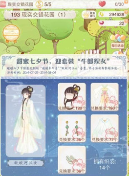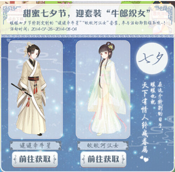 七夕活动开启两套时装,而且是情侣时装,让暖粉们看见了将来情侣套的希望啊!牵牛星套装要靠大家集体努力了,而织女套则需要玩家自己刷织羽了。