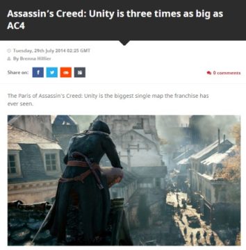 《刺客信条5大革命》中的巴黎将拥有系列最大的地图,新作中只有巴黎一座城市,但这它将比《刺客信条4黑旗》所有陆地面积总和还要大三倍。本作关卡设计师Nick表示玩家可以在15-20个小时内完成主线,但支线可能会花掉你约100个小时。而你可以非常流畅的感受这一切,因为次世代让整个城市完全无加载/读盘。