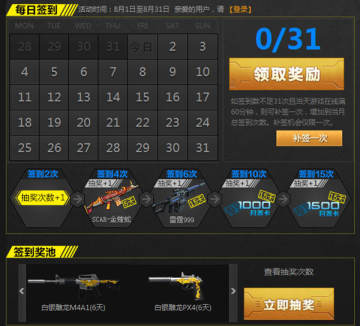 《逆战》2014年8月签到活动介绍 8月签到网址一览 来源: 飞翔小编 2014/8/1 11:06:50 浏览量:915 腾讯游戏《逆战》开启了2014年8月签到活动,玩家参与签到抽奖将有机会获得SCAR-金蝰蛇、雷霆999等强力武器,这里给大家分享下《逆战》2014年8月签到活动介绍,8月签到网址一览。活动时间:8月1日至8月31日签到奖励:抽奖奖励:注意事项:如签到数不足31次且当天游戏在线满60分钟,则可补签一次,增加到当月总签到次数。补签机会仅限一次。8月签到网址:http://nz.qq.com/act/a20140723Sign/