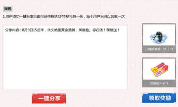 用户成功一键分享后即可获得粉钻CF特权礼包一份,每个用户只可以领取一次